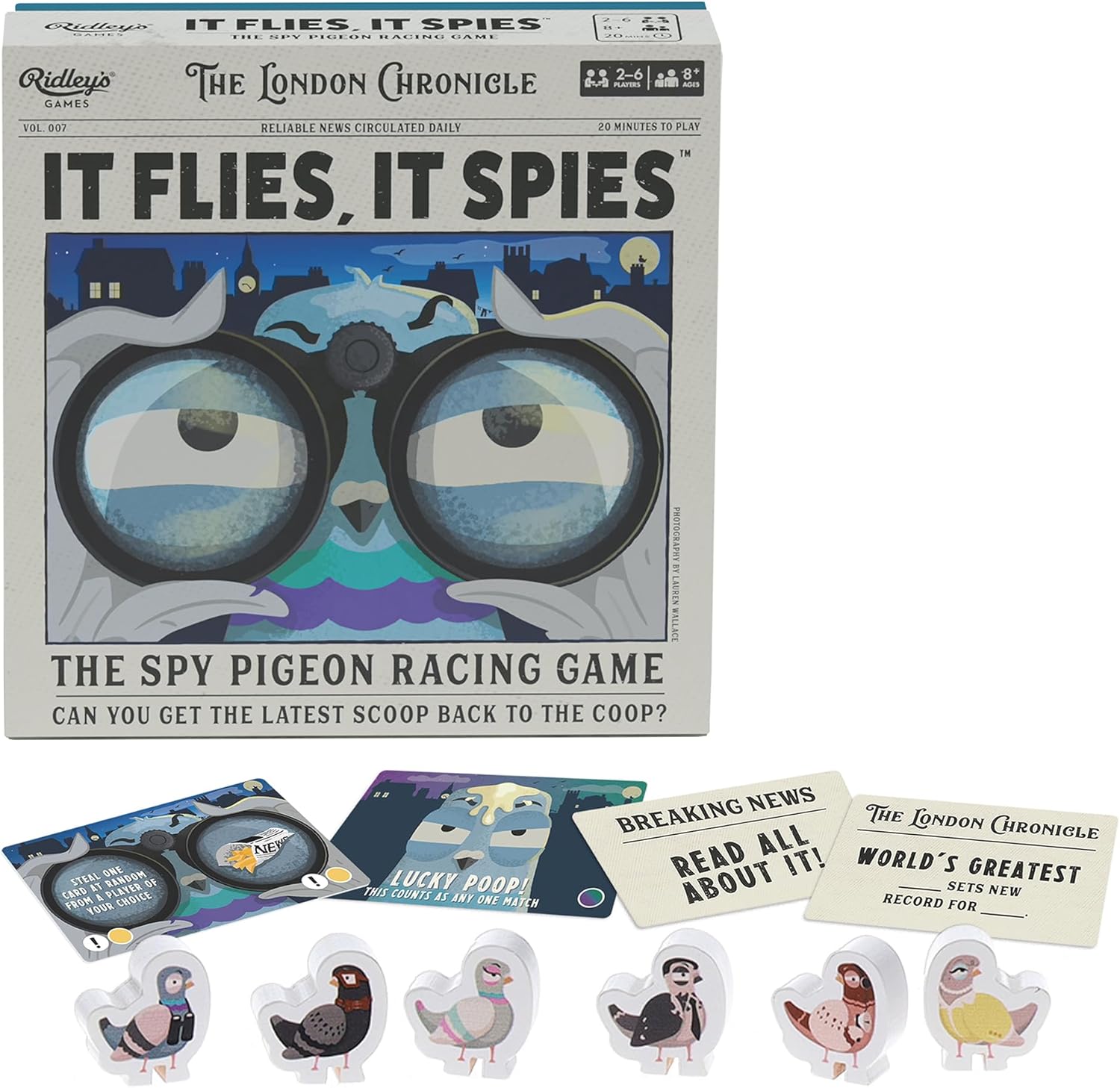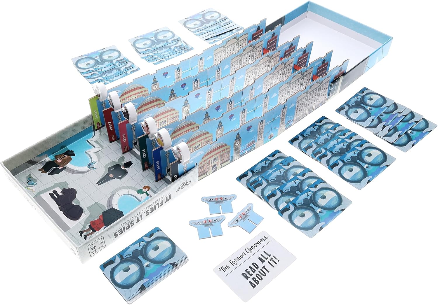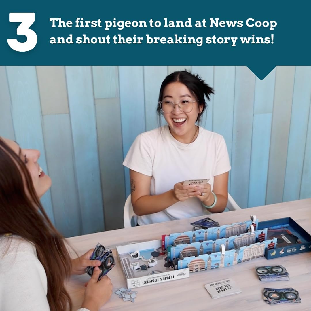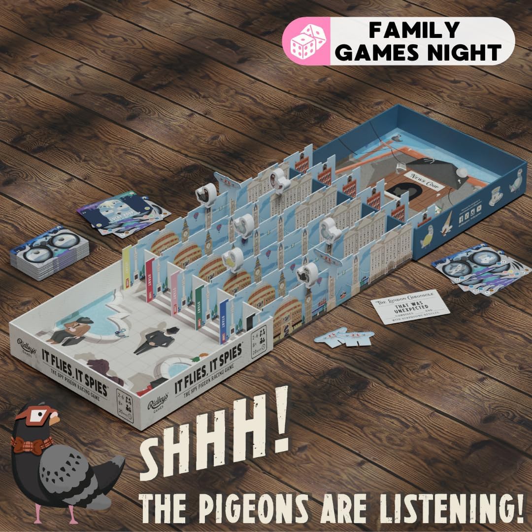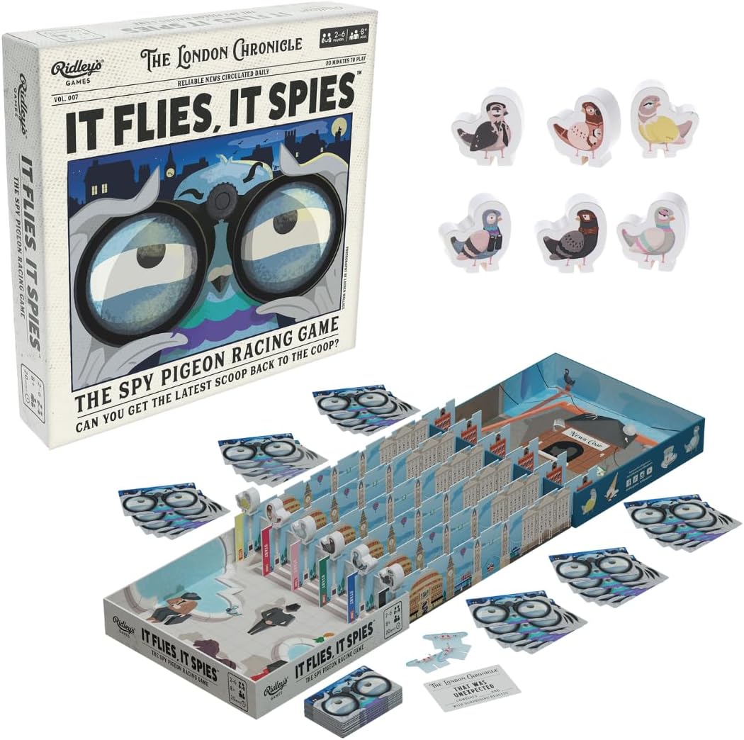 Ah! Itís not just about whatís inside the box with this one, because the box itself sets the scene of your adventure! You should remove the other bits though: the six unique wooden Spy Pigeon character meeples, six Flight Paths, 70 Game cards, 15 Headline cards, 5 Lucky Poop cards, 4 Drone tokens, instructions.