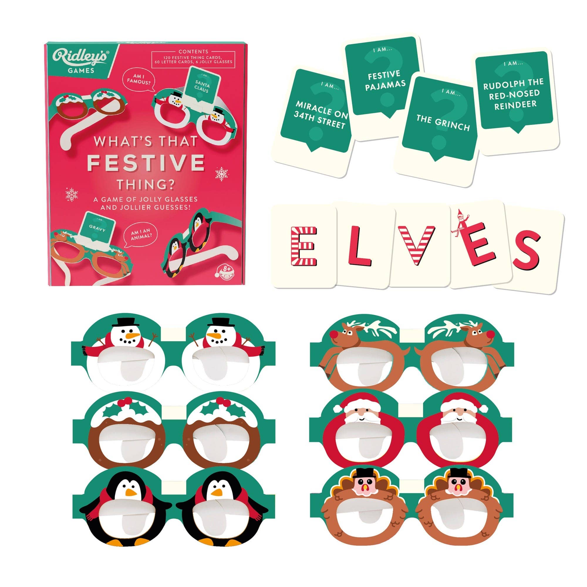120 Festive Things cards, 60 Letter cards, 6 pairs jolly card glasses, and instructions.