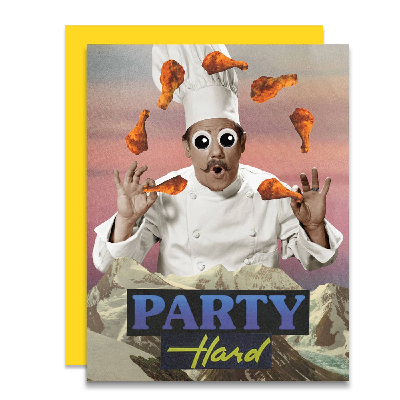 This surreal celebration card features a googly-eyed chef in full chaotic joy, surrounded by airborne drumsticks and vintage mountain drama.