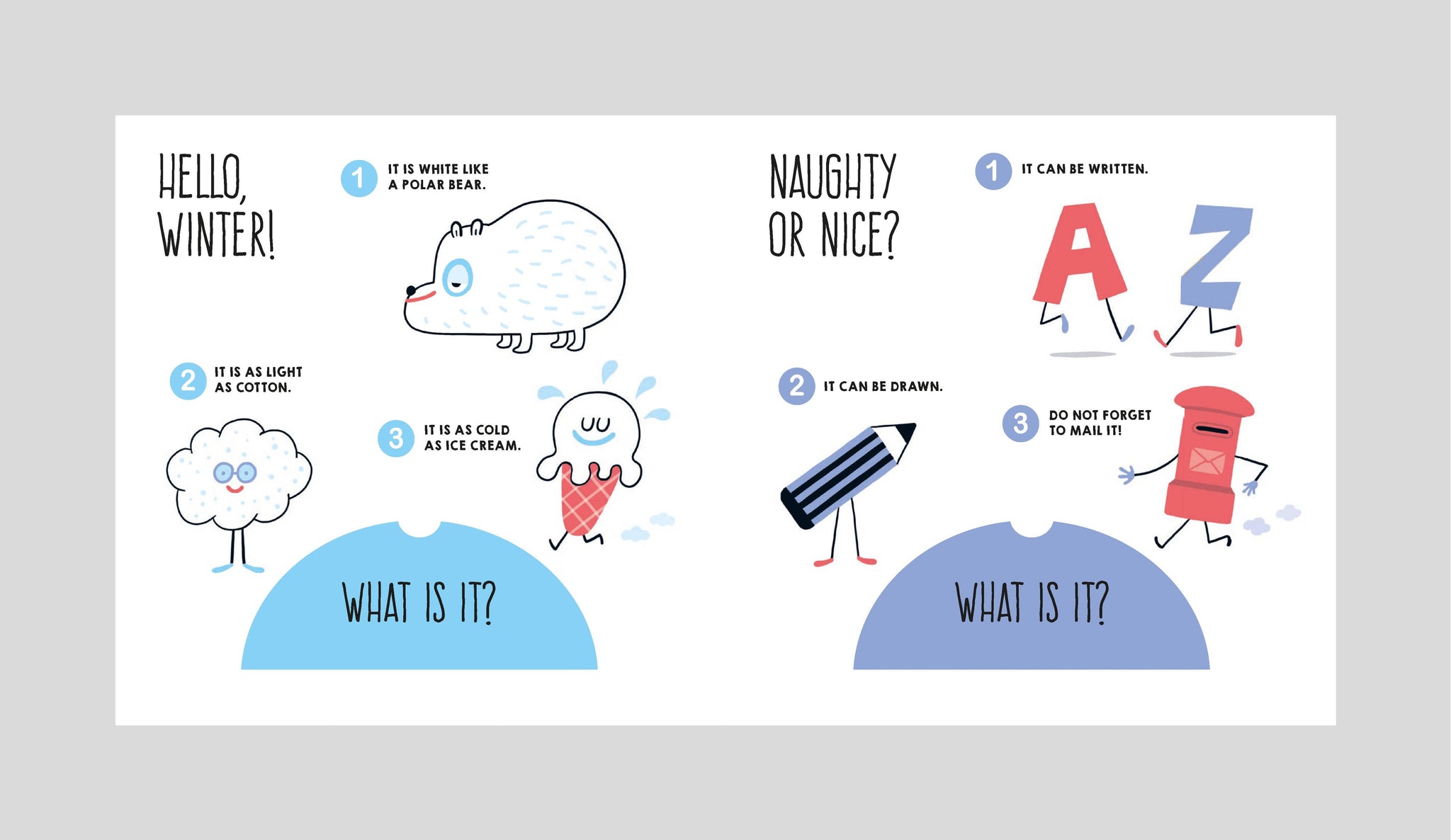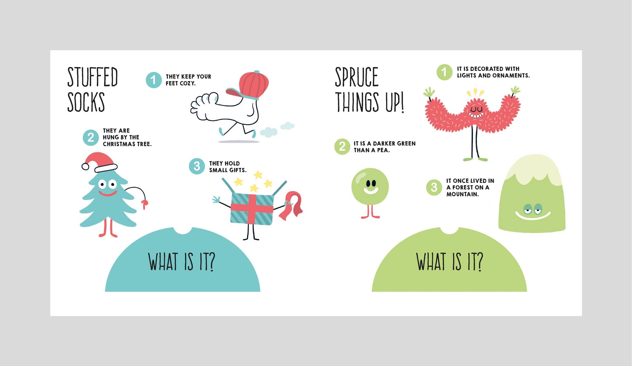 A Christmas-themed guessing game in a book: Consider the clues, then lift the flaps to discover the spirited answers!